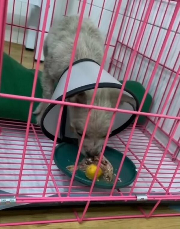 They set up a cozy, makeshift home for him where he could begin his recovery. Medicinal treatments were started to address his skin condition and help his fur grow back.