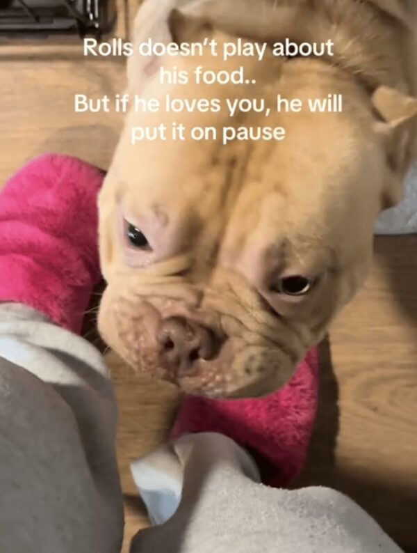 As the video unfolds, Rolls is seen eagerly devouring his meal, savoring each bite with joy. Everything seems normal until, in a moment of pure love, he pauses to glance at his human companion. Without a second thought, he leaves his bowl behind to shower his owner with affection, proving that love truly conquers all.